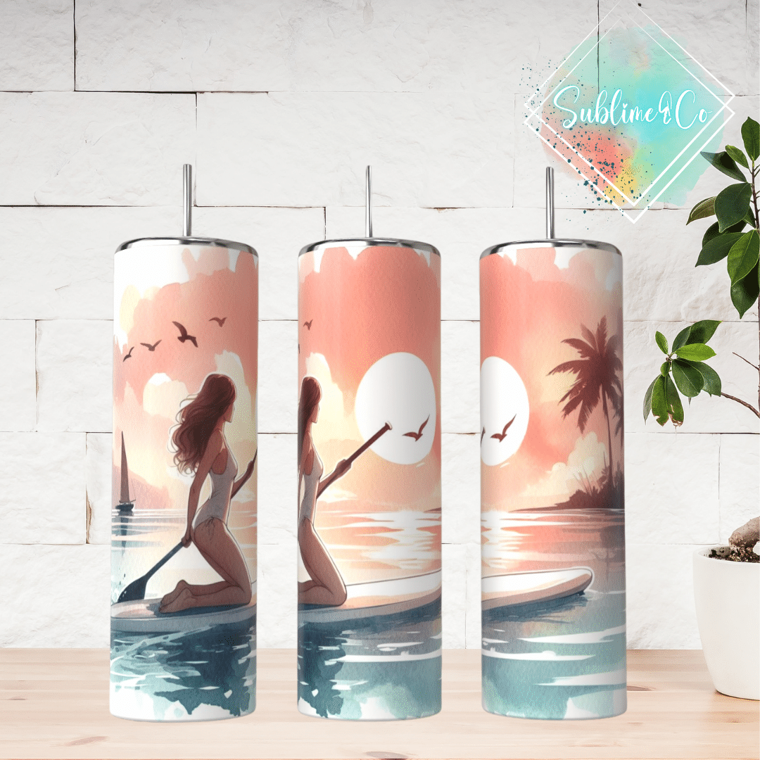 Embrassez l’esprit d’aventure avec notre verre isotherme de 20 oz, mettant en scène une femme en paddleboard, prête à conquérir les vagues ! Parfait pour garder vos boissons à la température idéale, que ce soit un smoothie rafraîchissant ou un café revigorant après une journée sur l’eau.