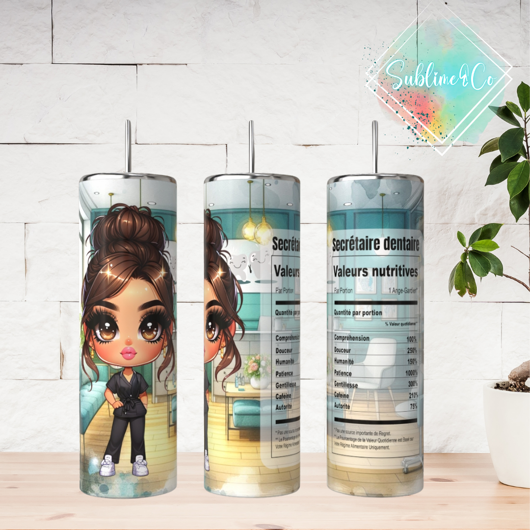 Pour la secrétaire dentaire moderne, ce verre isotherme de 20 oz combine style et fonctionnalité. Son design bleu apaisant met en avant des « valeurs nutritives » inspirées de votre quotidien : passion, soin et attention. Parfait pour garder vos boissons à la température idéale tout en reflétant l’énergie et le dévouement qui vous définissent.